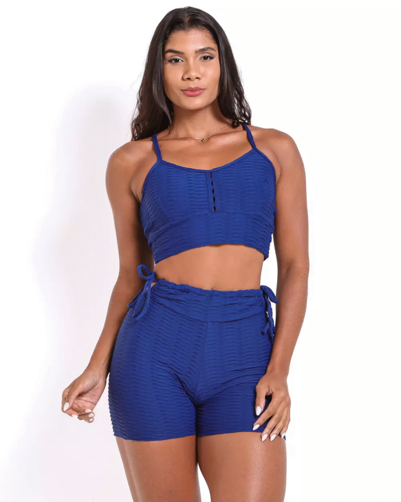 A modelo está usando Conjunto Short Empina Ajuste Textura Ondas + Top Búzios – Azul Marinho