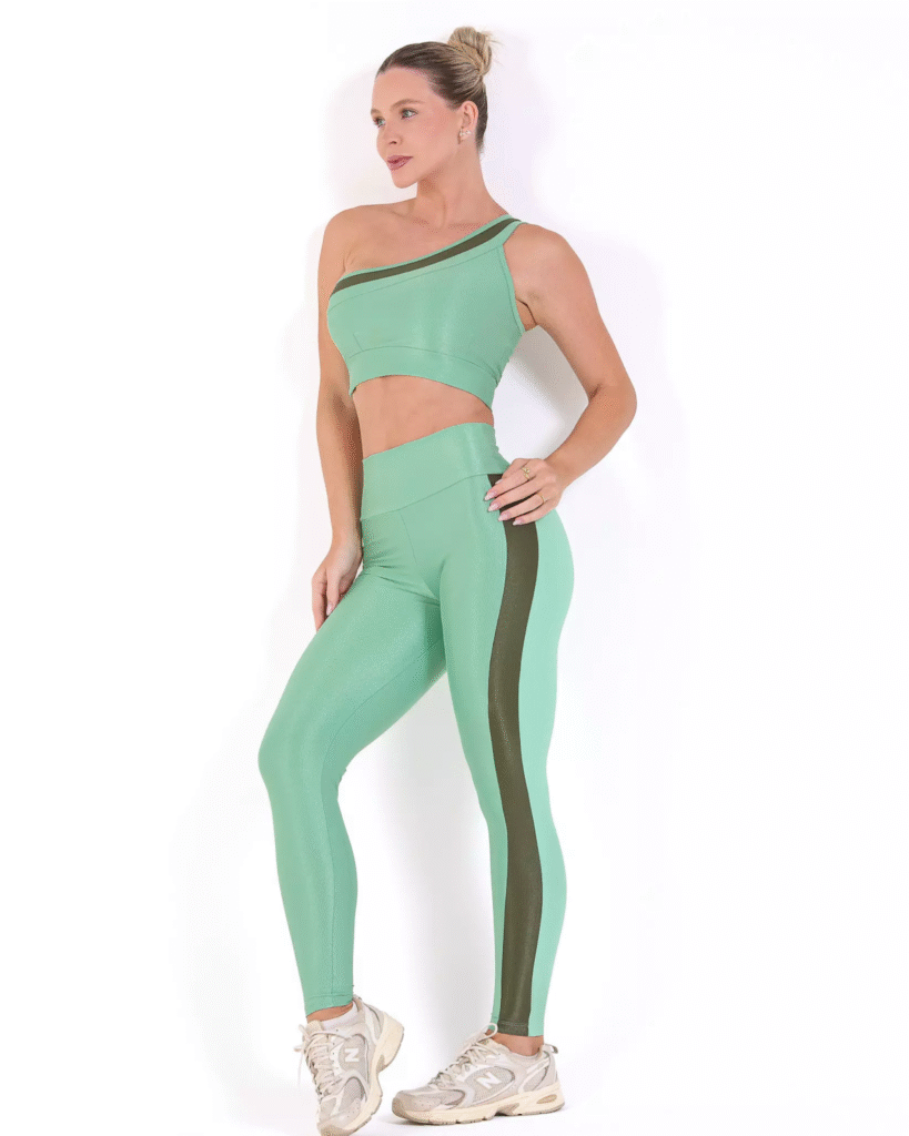 - Alta Gramatura e Zero Transparência: O tecido precisa ser denso. Materiais finos vão revelar a pele ou a roupa íntima quando você agachar. A Poliamida de alta qualidade é a melhor escolha aqui.