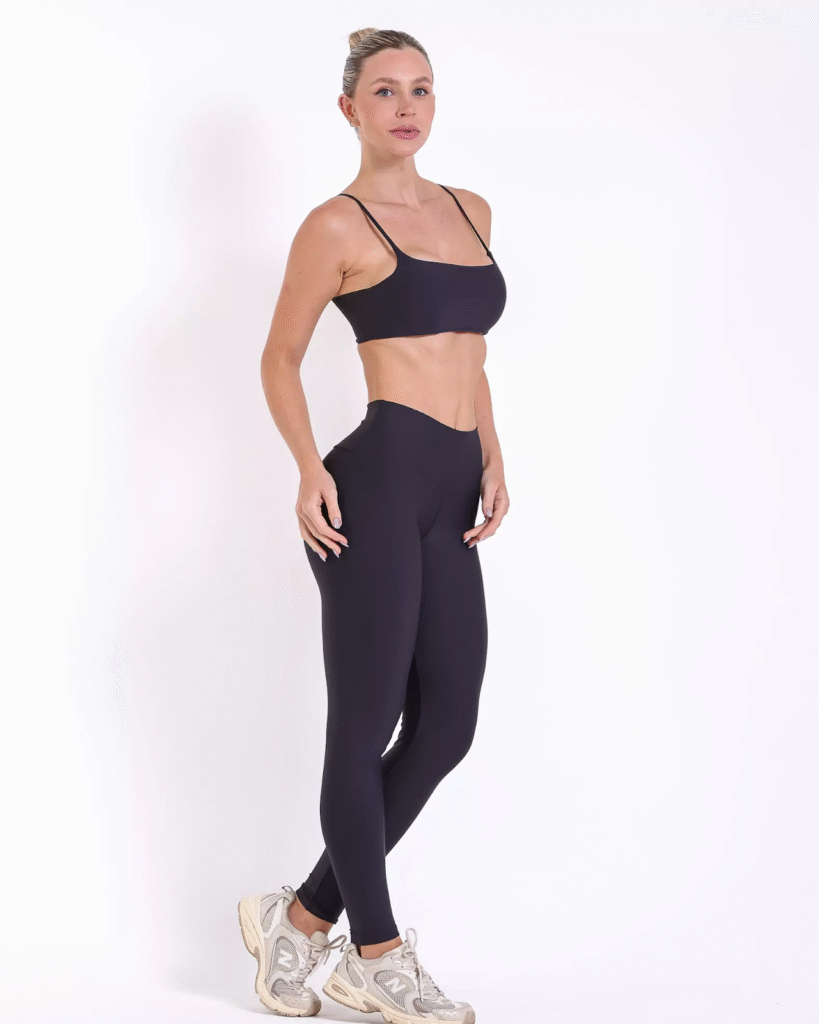 A modelo está usando o Conjunto Calça Legging Básica Light + Top Ju