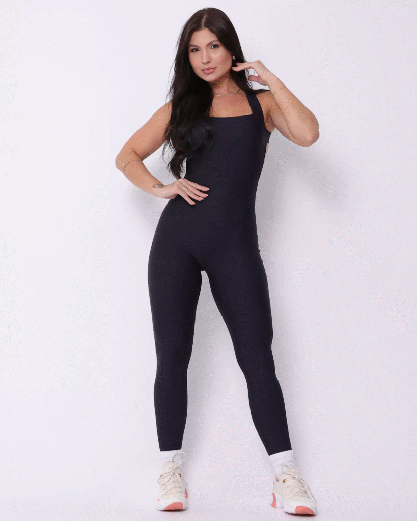 O macacão academia desenha a silhueta de forma fluida, valorizando as curvas sem criar cortes horizontais. Para maximizar esse efeito, dê preferência aos modelos lisos e em cores mais escuras ou neutras, como preto, azul marinho ou berinjela. É a escolha perfeita para um visual longilíneo, sofisticado e cheio de atitude.