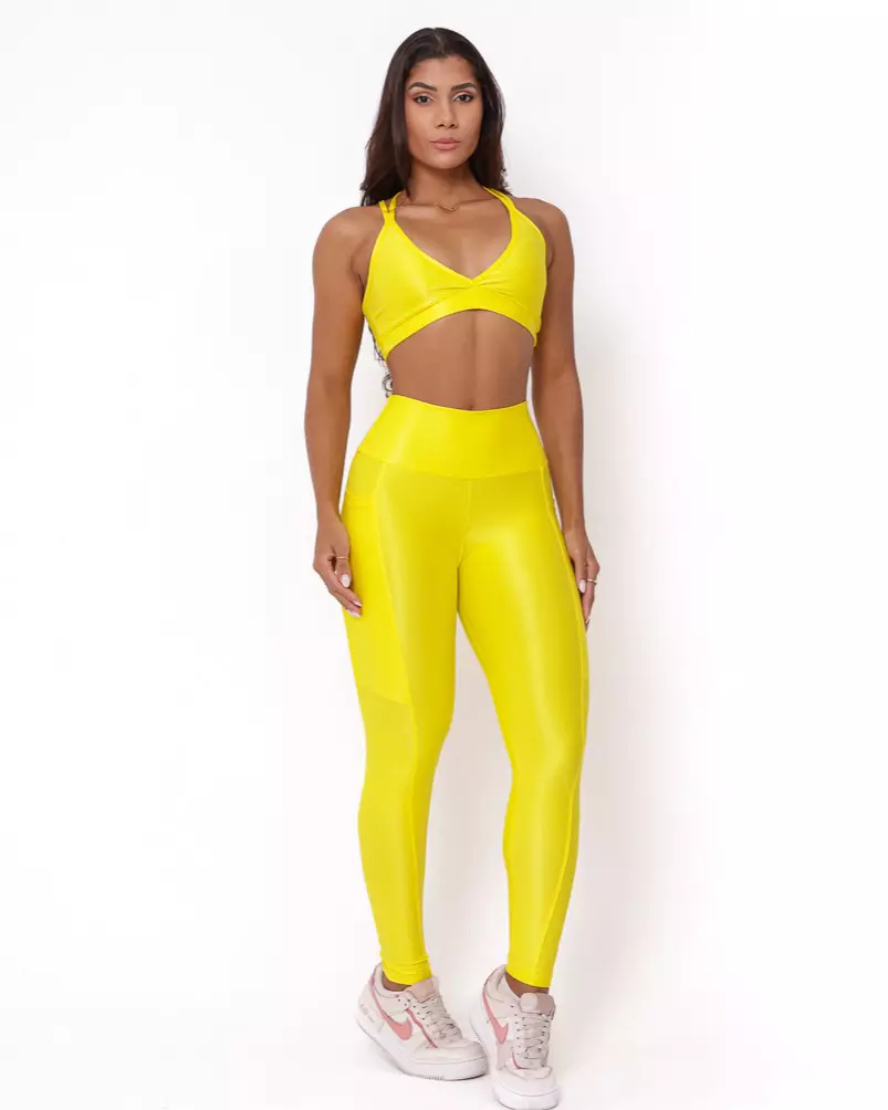 A modelo veste Conjunto Calça Legging Básica Bolso Compressão Ouro + Top Vivi